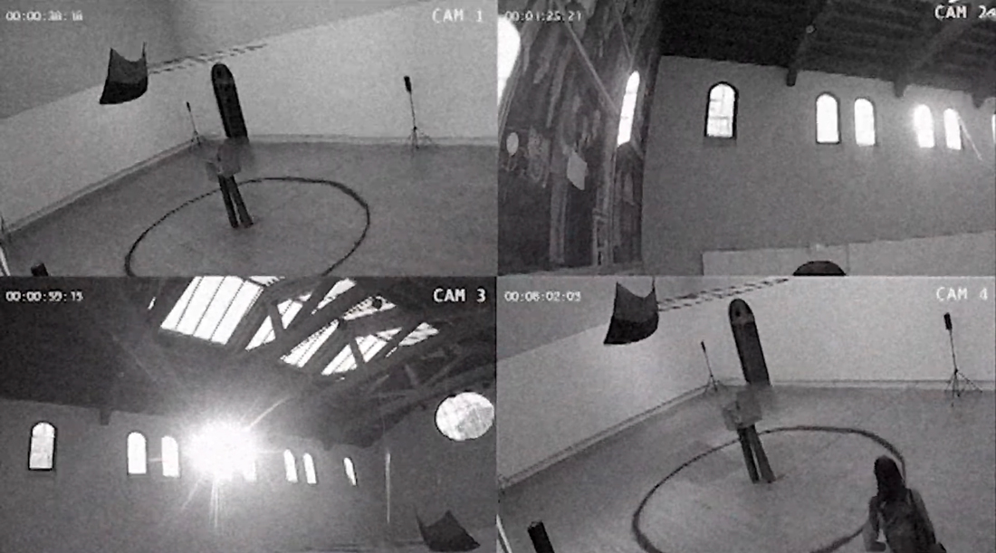 Materials: Wood, steel, glass, mirrors, linen, embroidered fabric, emergency blankets, water, sand, PVC, 5-channel soundscape