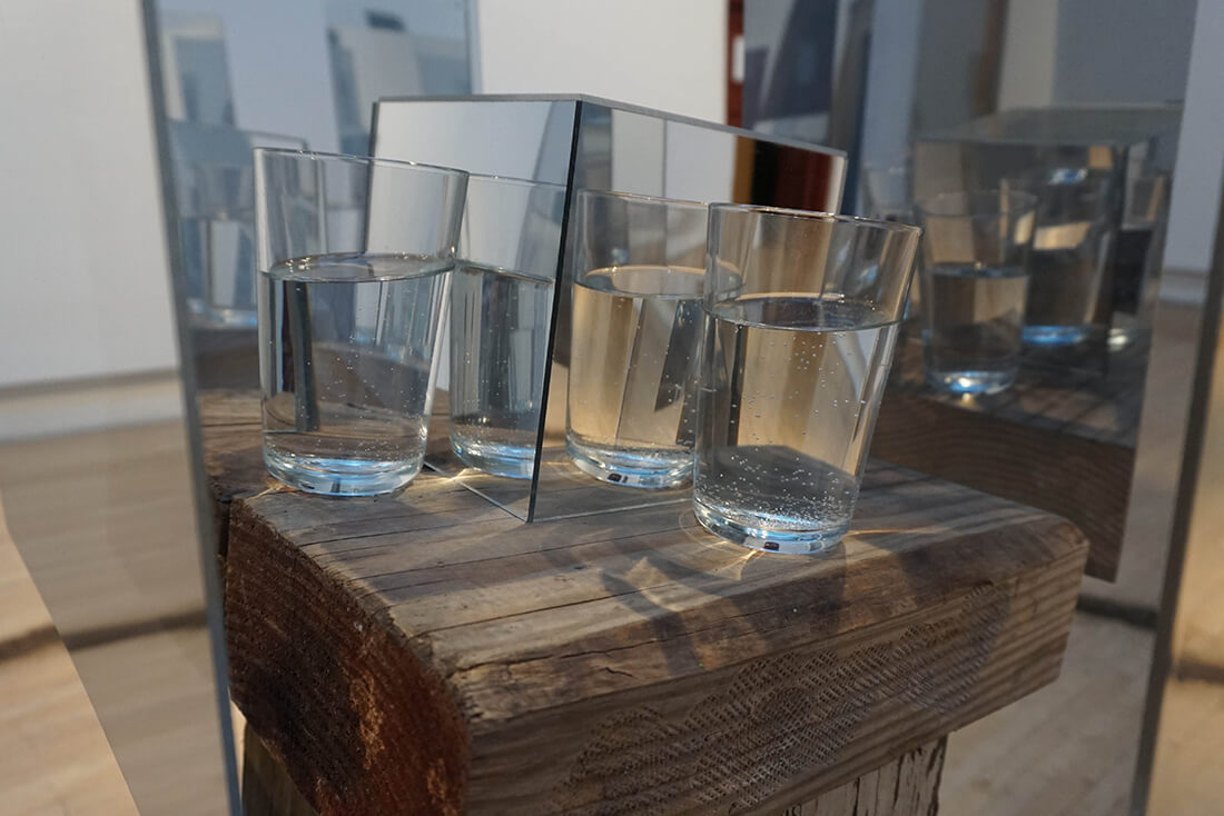 Light and water represent natural resources and bodies within contested environments enveloping the USA. Using the circular form of the oculus illuminating the gallery as a starting point, the discourse of corporeality is extended to architecture. Corporeal Prison relies on the architectural structures of the Diego Rivera Gallery - such as its rounded window and ceiling beams - to highlight this environment as a shelter for communal activities. Of particular interest is architecture’s function in compartmentalization and delineation of borders between different people. Personal borders, both tangible and intangible, can be a manifestation of efforts to protect oneself. A variety of ephemeral borders easily dissolved by shifting perspectives within the gallery reflects these concerns.